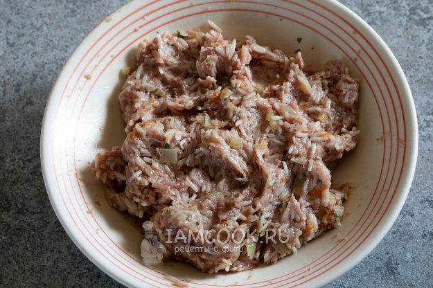Смешать фарш с рисом, луком, морковью и приправами.