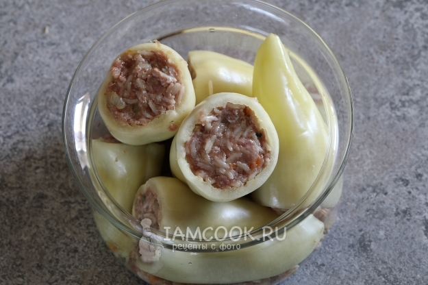 Нафаршировать перцы. Поместить остатки фарша на дно посуды для микроволновки, влить 2 столовых ложки воды. Поверх фарша разместить фаршированные перцы.