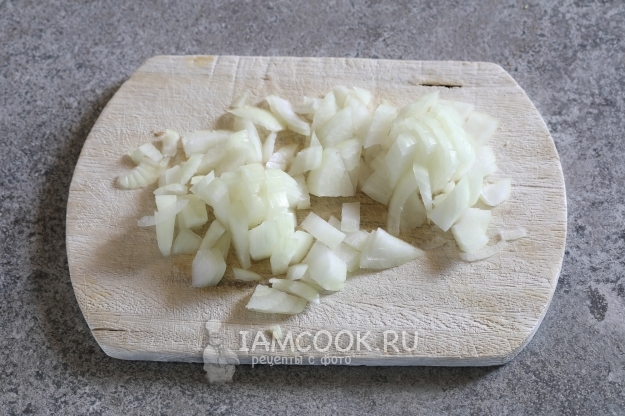 Пока варится рис, лук почистить и нарезать на кубики.