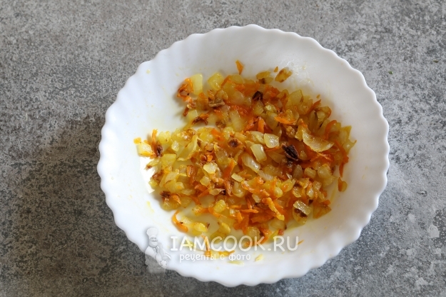 Когда сварился рис, поджарить в микроволновке лук с морковью и небольшим количеством растительного масла на мощности 800 Вт, 4-6 минут. По ходу обжаривания их нужно промешать, а на последних минутах следить за изменением цвета, чтобы не подгорели.
