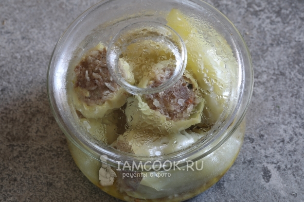 Закрыть емкость крышкой и тушить фаршированные перцы в микроволновке 20 минут на мощности 800 Вт.