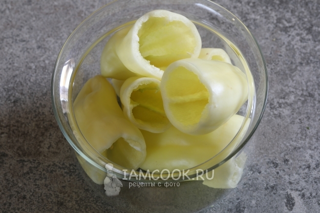 Пока жарится лук, срезать у перцев крышки с зелеными черенками и вычистить семена.