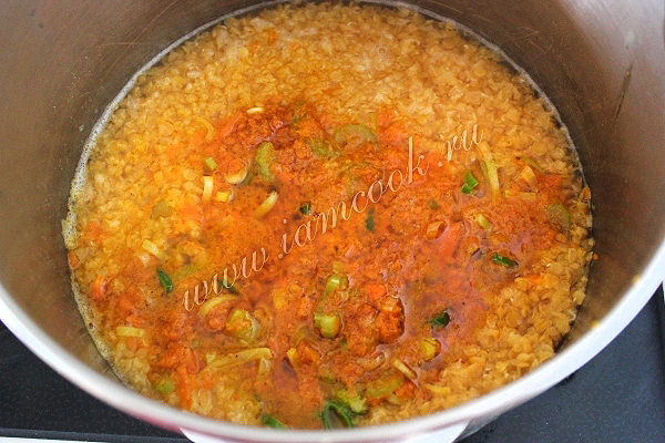 Пассерованные овощи добавить к в кастрюлю к разварившейся чечевице.