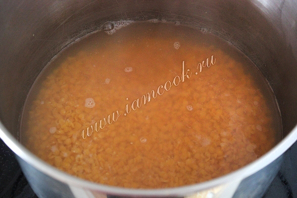Чечевицу промойте в сите, выложите в кастрюлю и поставьте на огонь.
