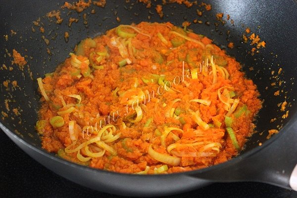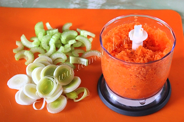 Пока чечевица варится, подготовим овощи. Порежем сельдерей и лук порей. Морковку можно натереть на терке, либо измельчить при помощи блендера.