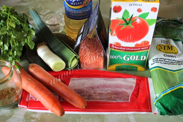 Подготовьте основные ингредиенты для супа-пюре: чечевицу, бекон, томатный сок, морковь, лук, сельдерей, зелень (тут кинза), специи, растительное масло и соль.