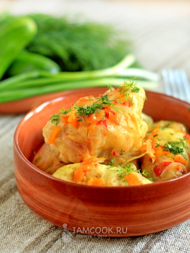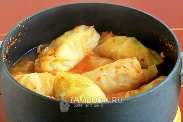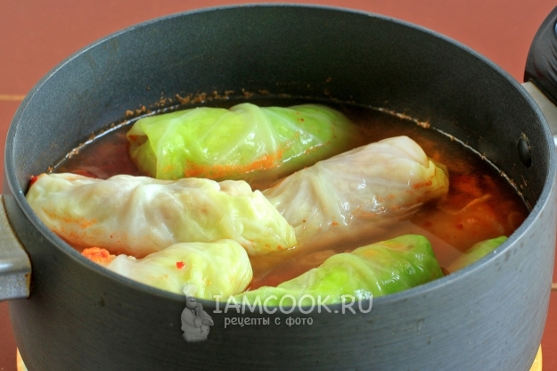 Выложите голубцы в кастрюлю с соусом. Если нужно, то долейте еще кипятка. Посолите, доведите до кипения, убавьте огонь и варите под крышкой до мягкости капусты. Время, конечно же, относительное и зависит от сорта капусты.