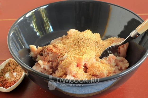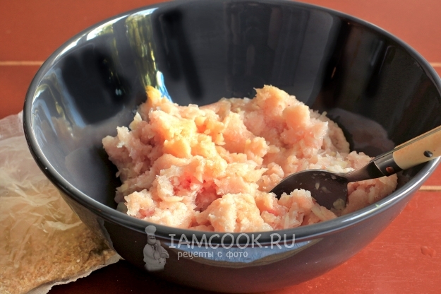 Из куриной грудки, одной луковицы и зубчика чеснока сделайте фарш.