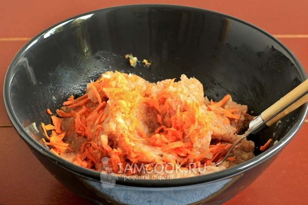 Половину натертой моркови добавьте в куриный фарш и хорошо перемешайте.