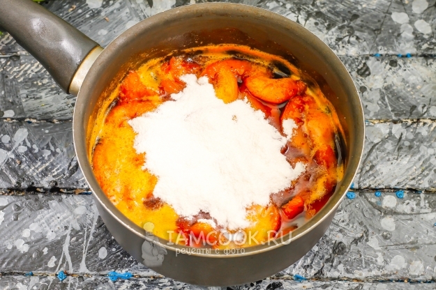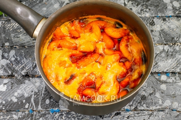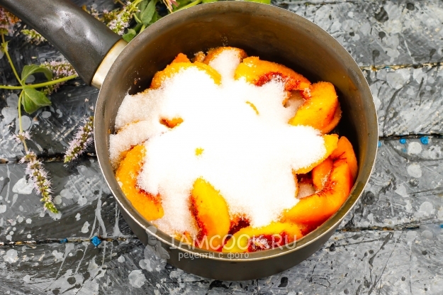 Засыпьте сахарным песком и поместите емкость на плиту. Если персики очень сладкие, то добавьте и 1 щепотку лимонной кислоты. К несочной нарезке влейте немного горячей воды.