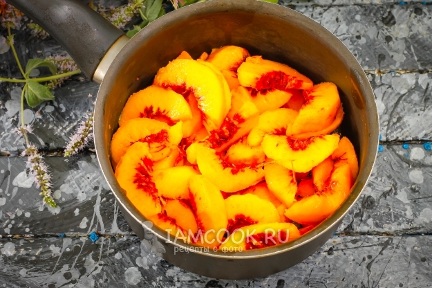 Очистите персики от кожуры, снимая ее с помощью ножа. Если кожура снимается с трудом, то сначала ошпарьте плоды кипятком, затем погрузите их на 2-3 минуты в ледяную воду и счистите кожуру. Промойте очищенные персики, располовиньте их и удалите косточки. Нарежьте в казан, сотейник или кастрюлю с антипригарным дном. Сильно измельчать не нужно - по желанию.
