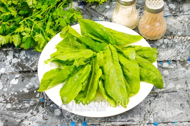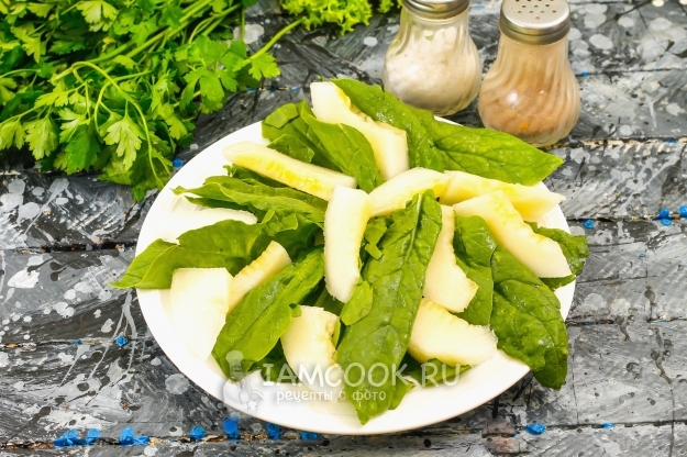 Промойте свежую зелень салата или шпината в воде, удалите стебли и тщательно стряхните, удаляя лишнюю влагу. Выложите на тарелке или блюде.