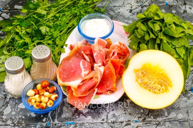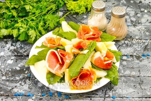 Разрежьте небольшую дыню на половинки, удалите семена и промойте. Нарежьте тонкими дольками, счистите кожуру. Дольки разрежьте пополам и выложите на зелень.
