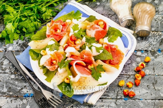 Украсьте прошутто с дыней свежей зеленью и подайте к столу сразу же после создания.