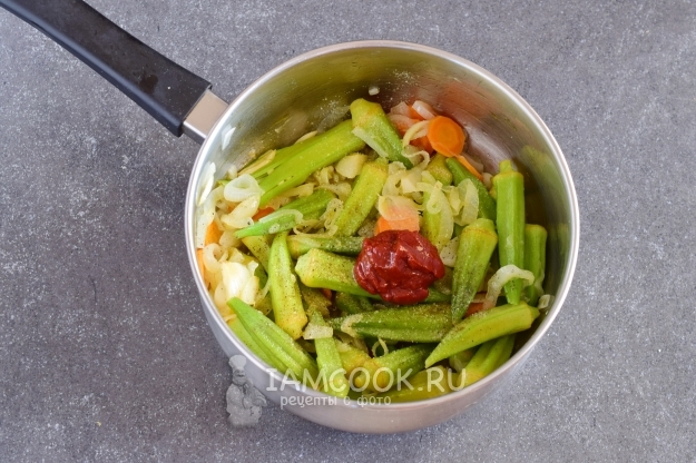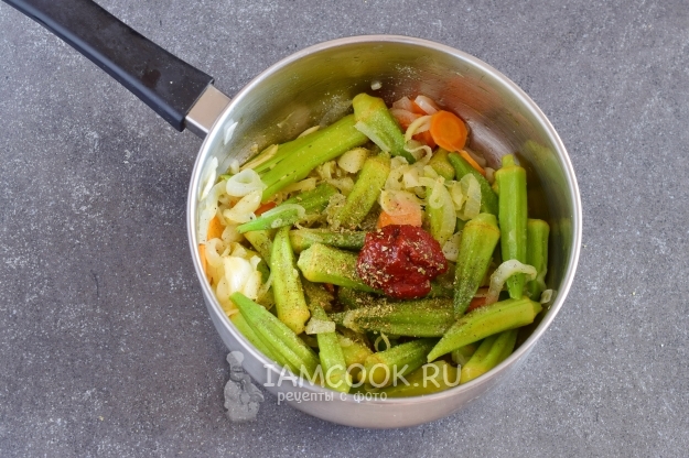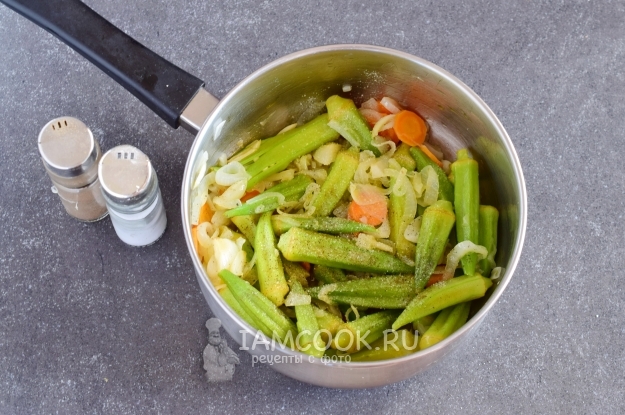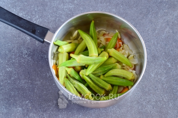 После этого к овощам в сотейник выложить окру. Продолжать жарить овощи еще 5-7 минут.
