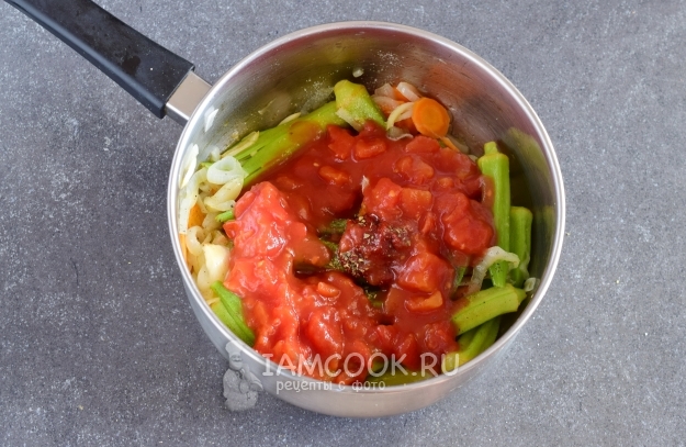 Выложить томаты в собственном соку, измельчив их кубиком. Можно просто добавить свежий помидор, сняв с него кожицу и нарезав мякоть помидора кубиком. Влить воду.
