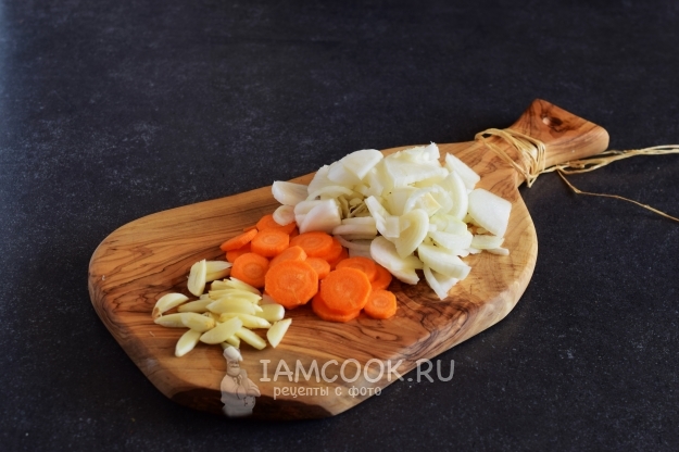 Лук репчатый нарезать полукольцами. Морковь нарезать кружочками, чеснок мелко порубить ножом.