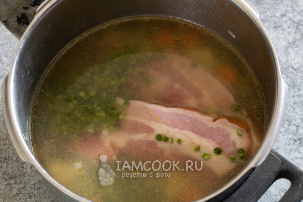 Добавляем бекон, горох и воду, закрываем скороварку крышкой, дожидаемся, пока она не закипит, и убавляем огонь с сильного на почти самый слабый.