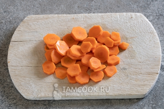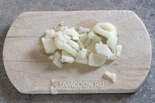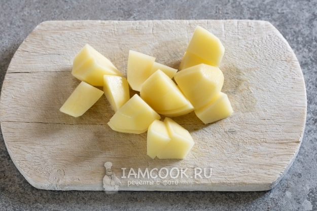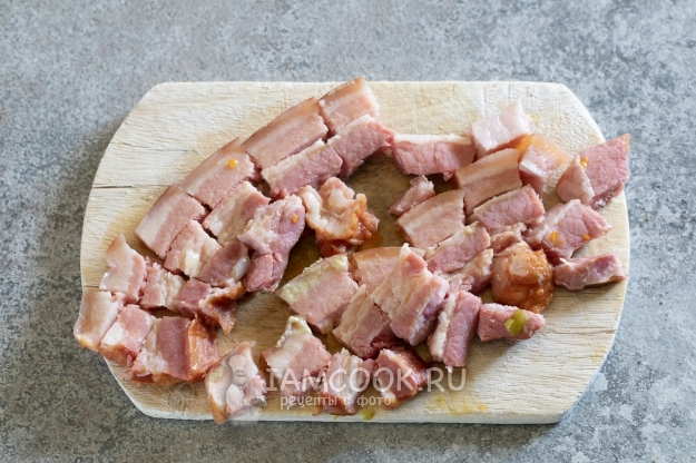 Если в конце варки чувствуете, что крышка скороварки открывается легко - откройте ее. Если скороварка при попытке открыть ее громко протестующе шипит - можете поставить ее так, чтобы на крышку текла холодная вода из-под крана, пока шипение не станет совсем тихим. Тогда скороварку можно открыть, извлечь бекон и, придерживая его вилкой, нарезать сначала на полоски, а потом на достаточно крупные кубики.