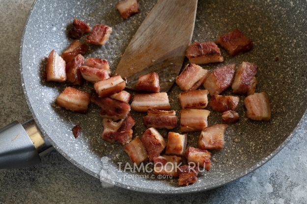 Обжариваем бекон на сильном огне, пока не подрумянится.