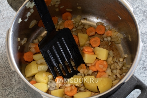 Обжариваем все овощи в небольшом количестве растительного масла при интенсивном помешивании в скороварке на сильном огне, пока лук не станет прозрачным.