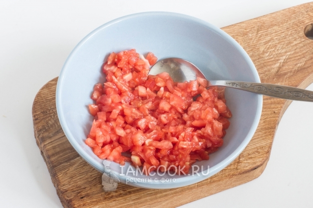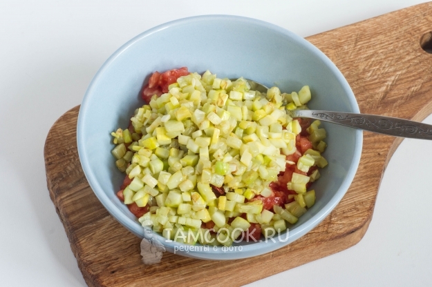 Помидоры промойте, удалите шкурку и семена. Помидорную мякоть, как и кабачки, нарежьте мелкими кубиками.