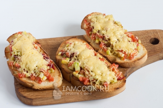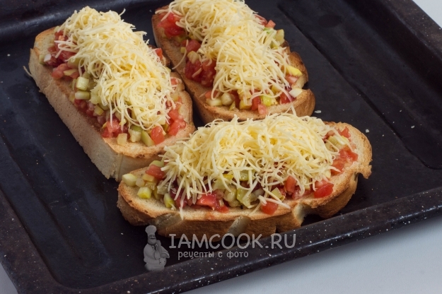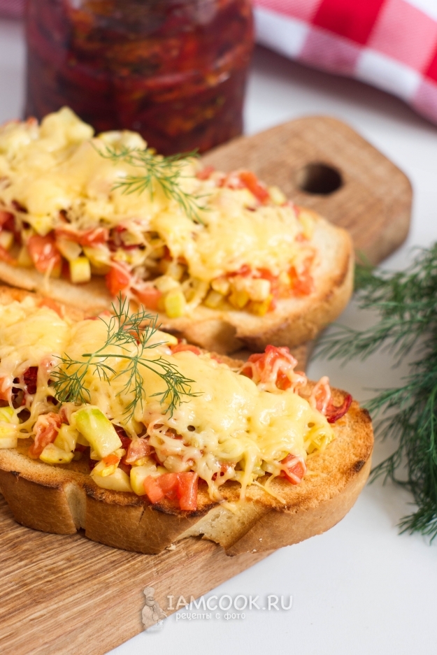 Выньте готовые горячие бутерброды с вялеными помидорами и кабачком из духовки и незамедлительно подавайте к столу!