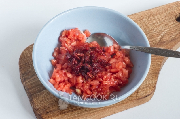 Добавьте к помидорам мелко нарезанные вяленые томаты.