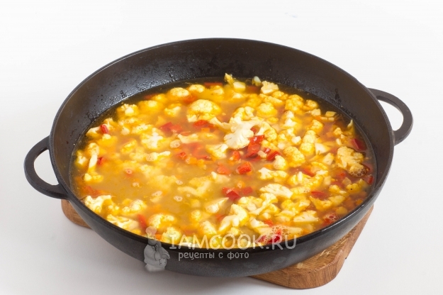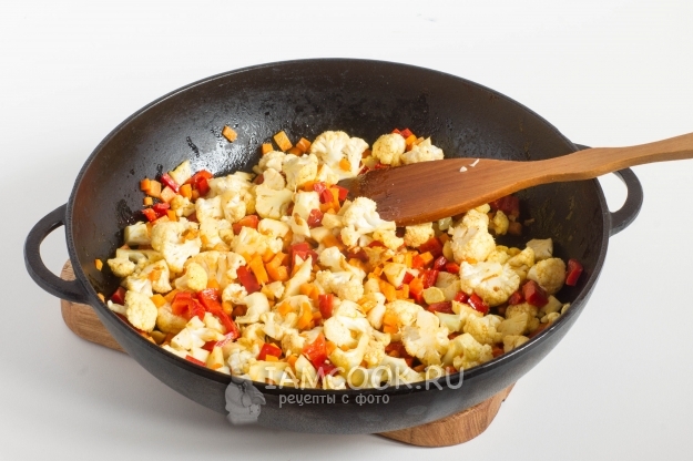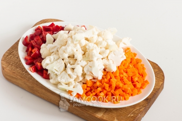 Овощи нужно почистить и мелко нарезать. Перец и морковь - кубиками, цветную капусту - соразмерно, небольшими ломтиками. Зимой, полагаю, что можно использовать замороженные овощи.