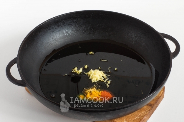 На сковородке разогрейте растительное масло, добавьте натертый на мелкой терке имбирь и пряности. Прогрейте их слегка в масле.