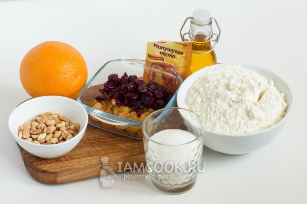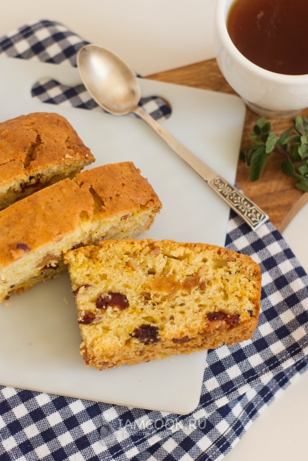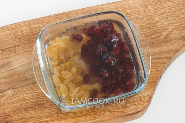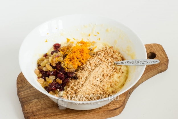 Добавьте сухофрукты (воду слейте), рубленые орехи и апельсиновую цедру.