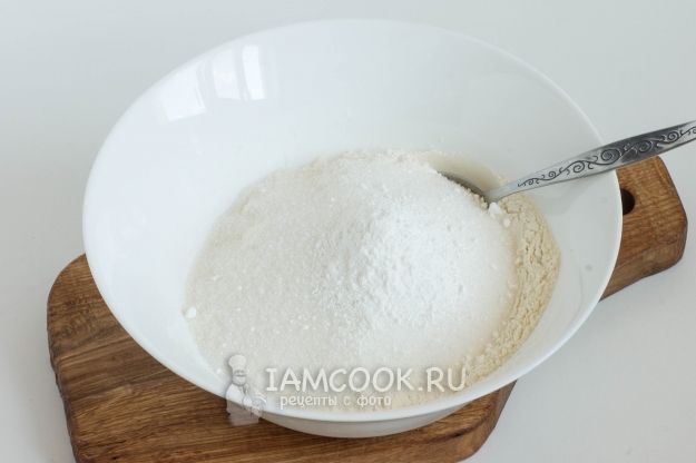 Соедините просеянную муку, сахар и мелкую соль, добавьте разрыхлитель и пряности по вкусу, если есть желание.