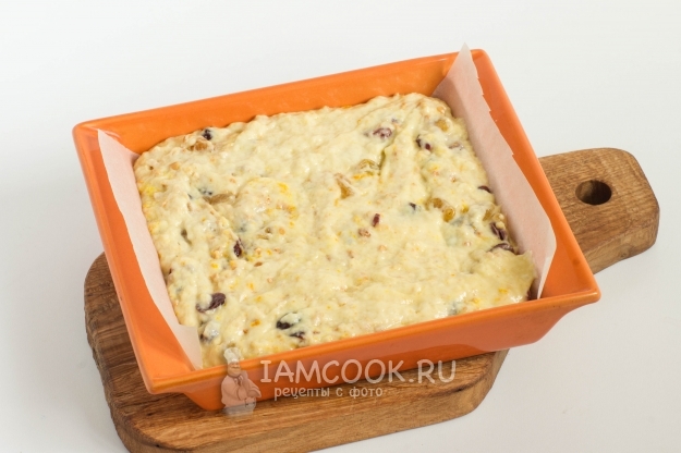 Перемешайте тесто, выложите в форму, застеленную пергаментной бумагой.