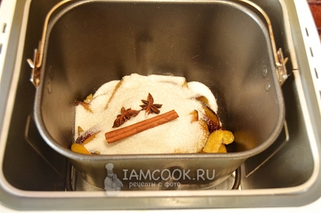 Добавим сахарный песок (если слива кислая, можно добавить больше), анис и палочку корицы (вместо палочки можно взять молотую). Закрываем крышку хлебопечки, устанавливаем программу «Варенье, джем» или аналогичную. Время приготовления в моей модели - 1 час 20 минут. В других хлебопечках время может незначительно изменяться.