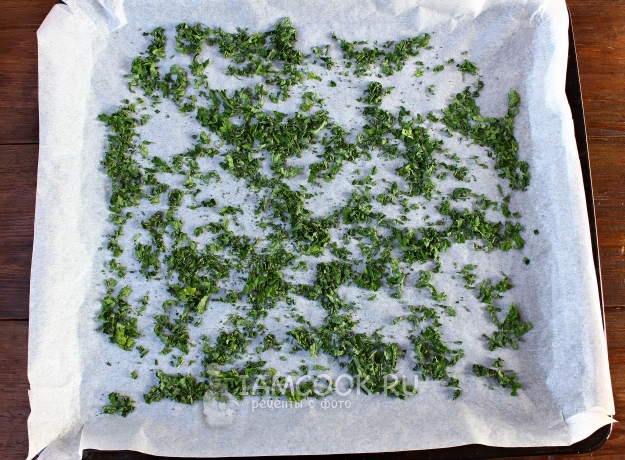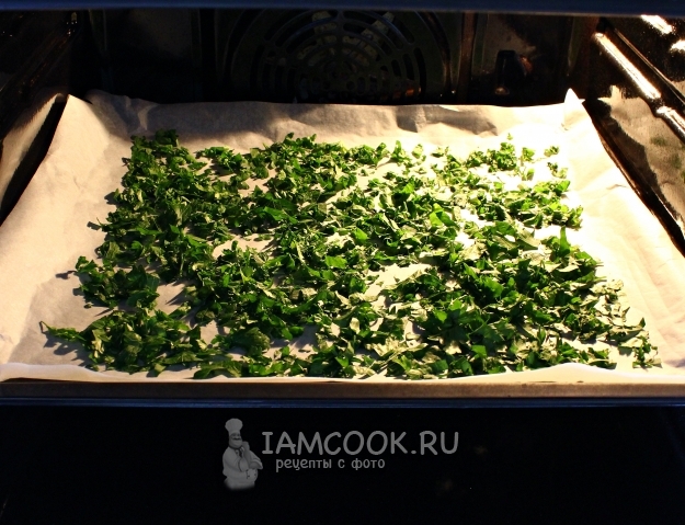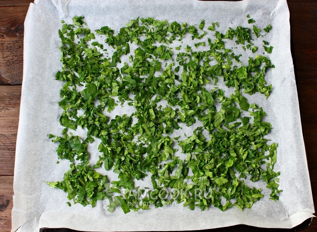 Готовность петрушки очень просто определить на ощупь. Для этого берем в руку немного зелени с противня и сжимаем, качественно высохшая петрушка будет рассыпаться.