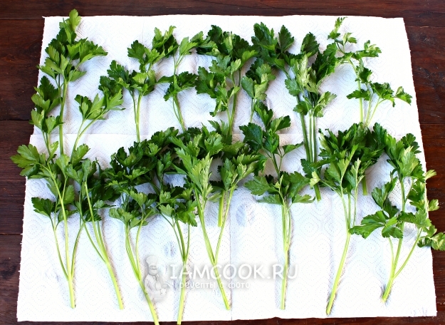 Срезанную зелень перебираем, удаляя пожелтевшие или вялые веточки. Укорачиваем стебель и хорошо промываем петрушку в прохладной воде. Затем стрясаем лишнюю влагу, раскладываем тонким слоем на бумажные полотенца и даем обсохнуть. Для ускорения процесса высыхания петрушку можно промокнуть полотенцем.