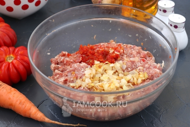 Одну луковицу нарезать кубиками и обжарить на растительном масле, добавить к фаршу. Также в фарш добавить немного томатного соуса, аджики или протереть помидор. Это нужно для того, чтобы начинка не получилась сухой. Я всегда делаю по-разному, в этот раз добавила аджику. Фарш хорошо перемешать.