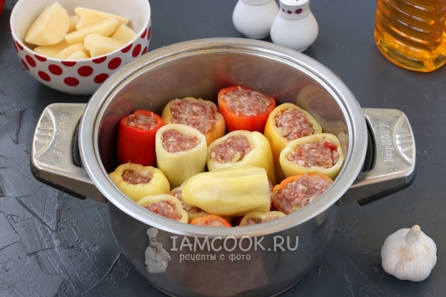 Перец поставить в кастрюлю вертикально, в промежутки между перцами вставить картофель, нарезанный крупными ломтиками.