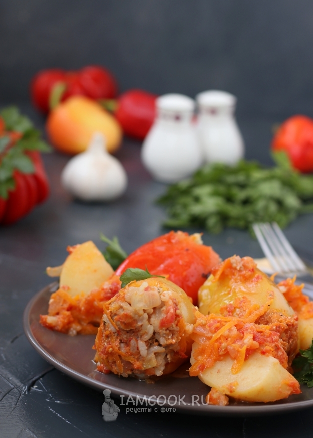 Раскладываем фаршированный мясом перец с картофелем по порциям и подаём к столу.