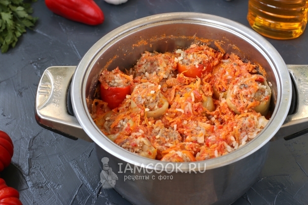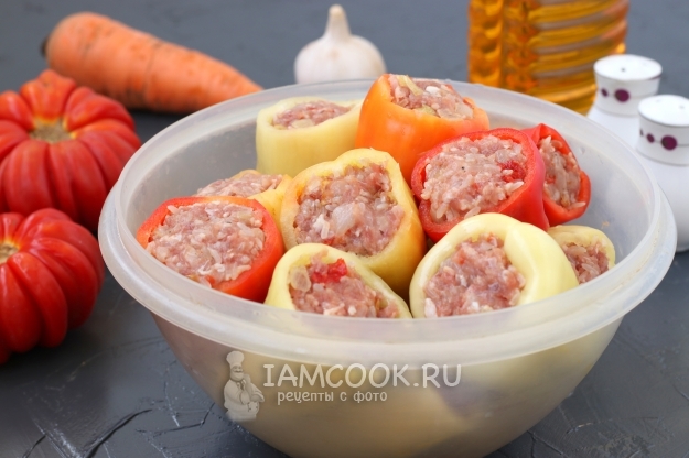 Наполняем перцы фаршем, но не плотно, так как рис разварится и заполнит свободное пространство.