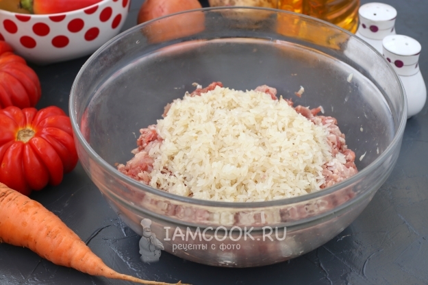Фарш можно использовать любой, я очень люблю смешивать 2-3 вида. В этот раз у меня свинина-говядина-индейка. Фарш выложить в миску, посолить и поперчить, хорошо перемешать. Рис промыть в нескольких водах и добавить к фаршу.