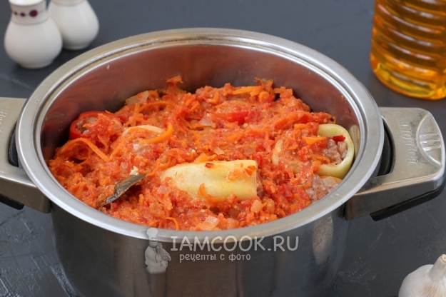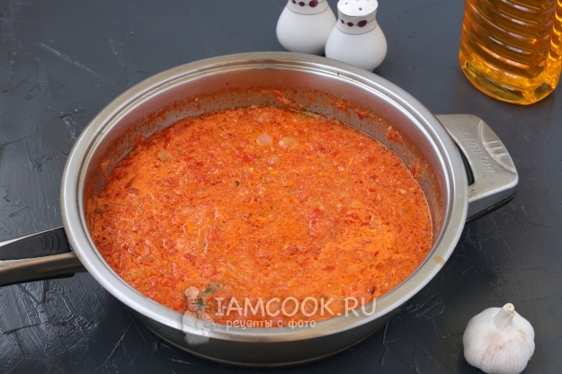 После этого можно приступать к приготовлению подливы. На растительном масле обжарить вторую луковицу, нарезанную кубиками, и натёртую на тёрке морковь. Затем добавить измельчённые помидоры. Посолить и поперчить. Вместо помидоров можно использовать томатный сок или разбавленную водой томатную пасту.