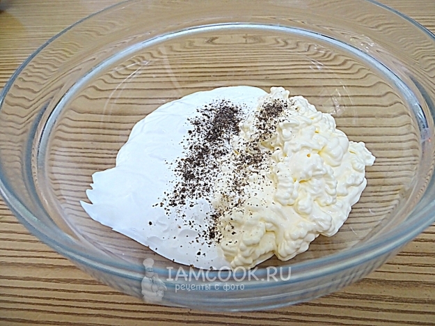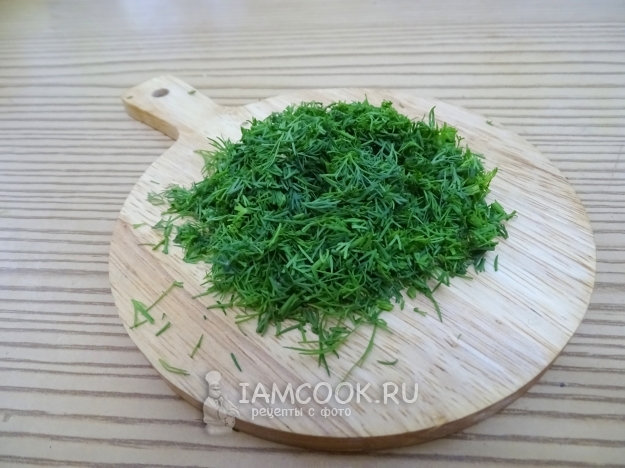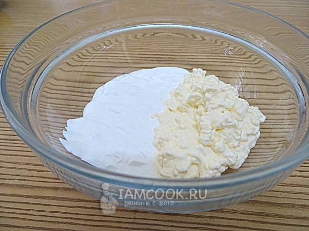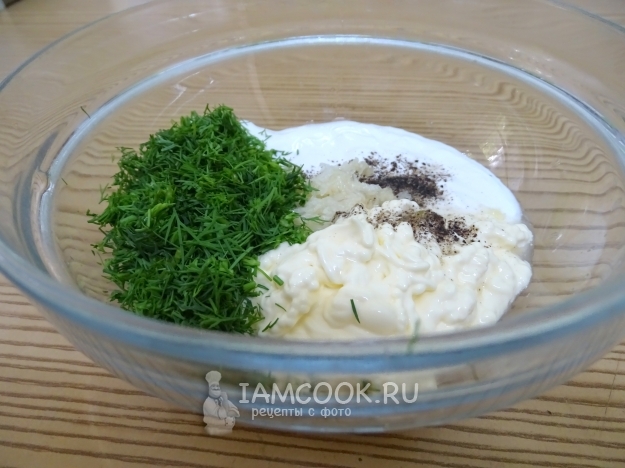 Добавляем чеснок и укроп к сметане и майонезу. Перемешиваем.
