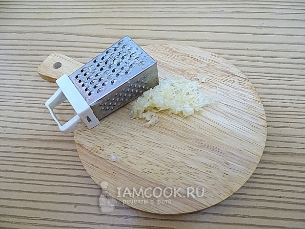 Чеснок натираем на тёрке с мелкими отверстиями или выдавливаем через пресс.