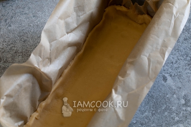 По истечении получаса извлекаем песочное тесто из холодильника, раскатываем его, вырезаем пласт нужного размера и помещаем в форму. Если форма неразъемная и с высокими бортиками, то тесто должно находиться на кондитерской бумаге, чтобы его удобно было извлекать. Обрезаем остатки с краев. В принципе, если есть желание, из них можно сделать какие-нибудь украшения для пирога. Нет - не делаем.