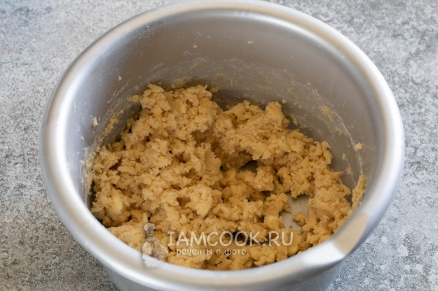 Из сливочного масла, сахарного песка, муки и яйца вымешиваем крошковатое песочное тесто.
