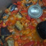 Очистите болгарский перец от семян, промойте плоды внутри и снаружи, нарежьте крупными кусочками. Перемешайте овощи в емкости и выложите на них нарезку перца. Накройте казан крышкой и тушите блюдо около 10 минут. Сока, выделенного томатами, вполне хватит для тушения. Если томаты были не сочные, то влейте добавочно 100 мл горячей воды в емкость.