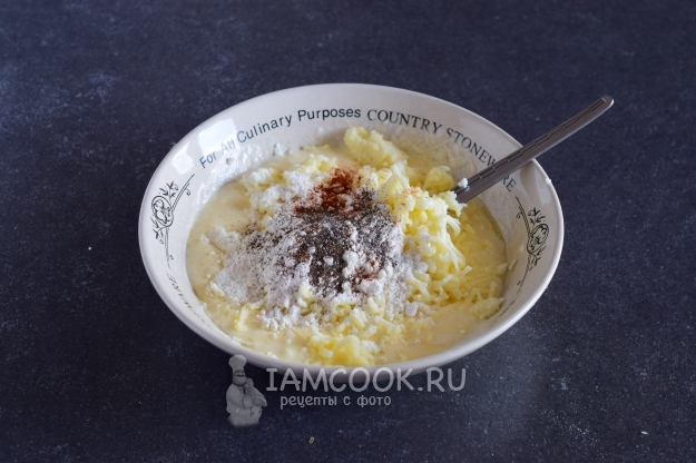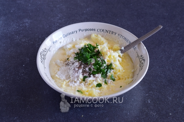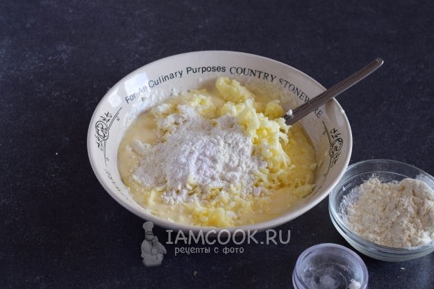 Добавить натертый на средней терке твердый сыр, муку и пекарский порошок.