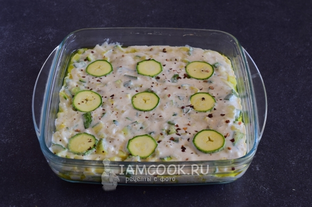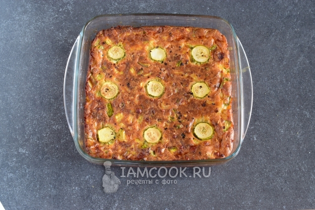 Для красоты можно нарезать один кабачок на тонкие кружочки и украсить ими верх запеканки, как показано на фото.
