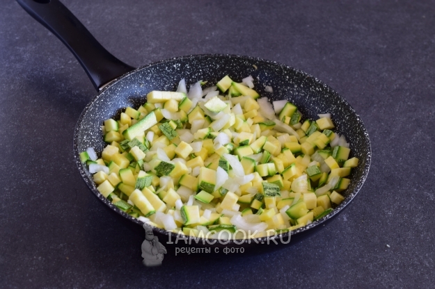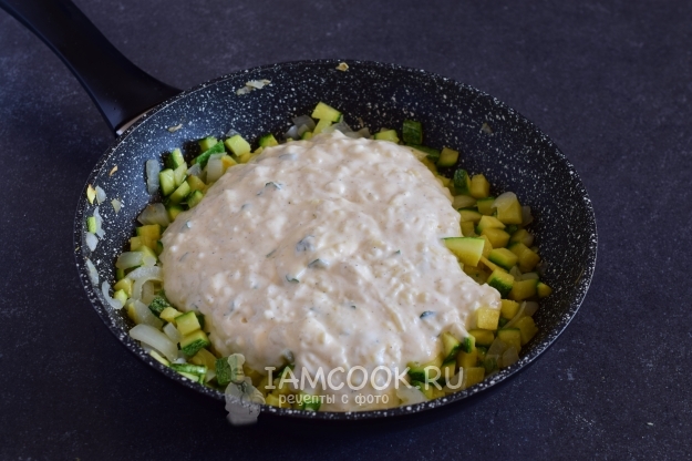 В сковороду с обжаренными кабачками и луком перелить заливку и все хорошо перемешать.